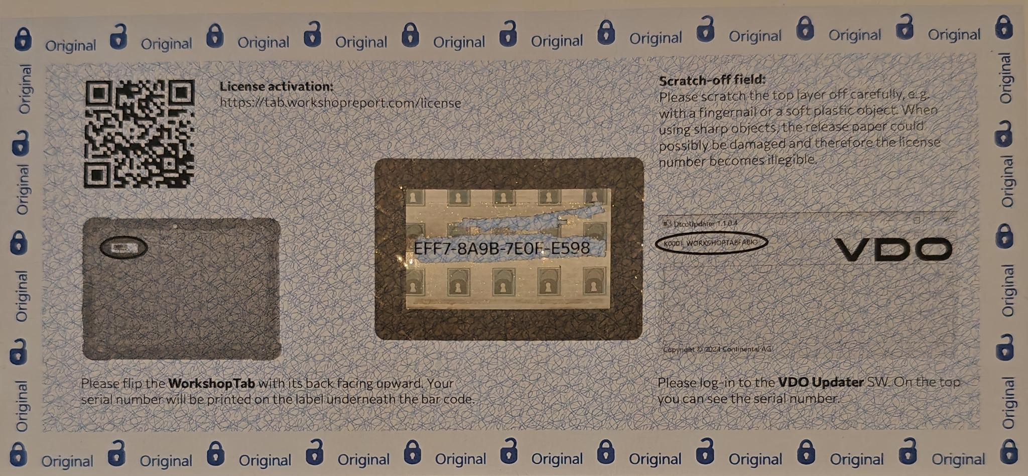 VDO älypiirturin päivityslisenssi (10kpl) mahdollistaa VDOn älypiirtureiden päivityksen VDO Updater -ohjelmistolla ja VDO WorkshopTab -piirturitestereillä. Lisenssi pitää sisällään kymmenen päivitystä. Lisenssit toimitetaan A4-dokumenttina, jonka alareunassa on raaputettava lisenssikoodi, joka tulee syöttää VDOn sivuilta löytyvään aktivointikenttään.